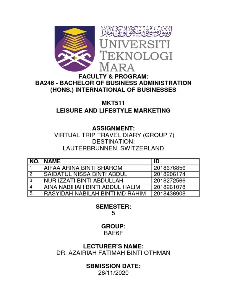 Faculty hotel and tourism management. · group member name 1 (2019######) · footer menu · you . Group assignment mkt universiti teknologi mara perlis bba hons human resource march july. Norliza che yahyafaculty of business and managementuitm, puncak alam campus42300, selangor.tel (office):(+603) 3258 7077norliza9911@uitm.edu.my . Contoh front page assignment uitm.